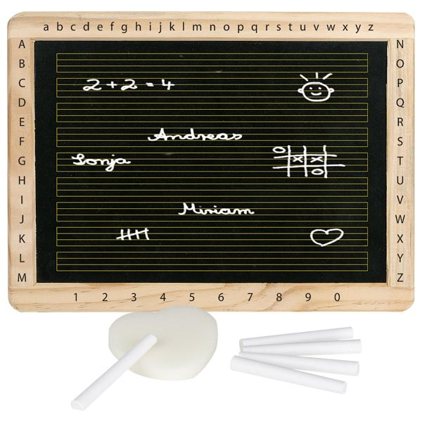 Tabliczka z drewnianą ramą w linie, w zestawie: gąbka i 3 kredki
