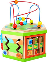 Drewniany sześcian edukacyjny posiada, aż 7 motorycznych możliwości zabawy i nauki dla dziecka. Zabawa kostką poszerza koordynację ręka-oko oraz poprawia kreatywność dziecka.