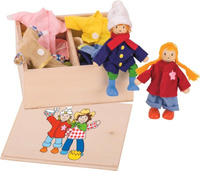 Laleczki w skrzyneczce z ubraniami to drewniane figurki z giętkimi kończynami (grube sznurki). W zestawie drewniany kuferek oraz 8 kompletów ubrań.
