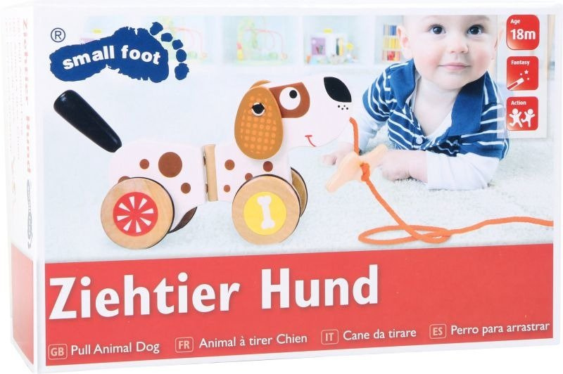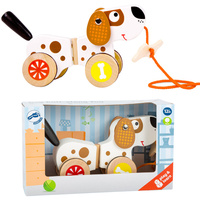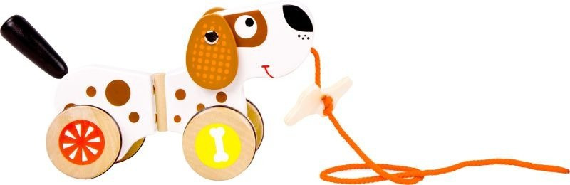 Drewniany piesek do ciągnięcia na sznurku, poruszający ogonem i uszami podczas zabawy. Posiada gumowe osłonki na kołach ograniczające hałas.