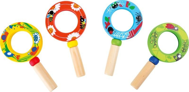 Ta zabawka to świetne narzędzie do obserwacji małych stworzeń, które normalnie uchodzą naszej uwadze, a dla dziecka stanowią obiekt fascynacji. Rączka i obramowanie szkiełka zostały wykonane z drewna i pokryta kolorowymi obrazkami małych owadów.