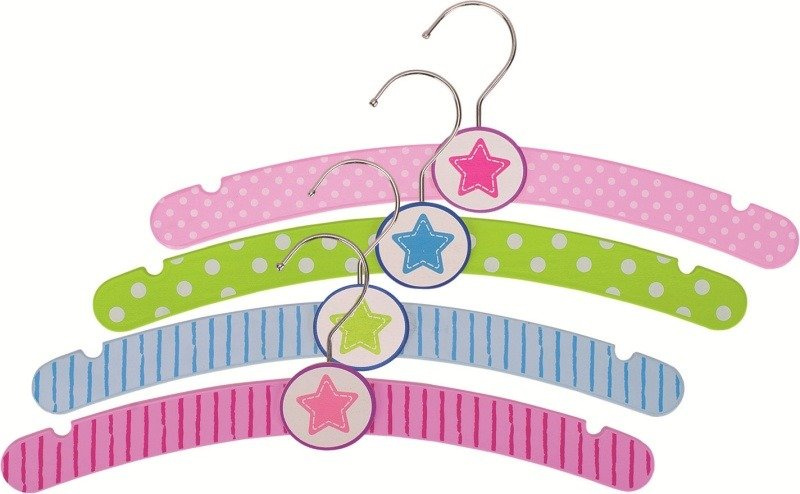 Komplet składa się z 4 kolorowych wieszaków o różnych motywach, każdy z emblematem przedstawiającym małą gwiazdę. Zestaw marki Goki został wykonany z drewna i stanowią zabawny dodatek do dziecięcego pokoju.