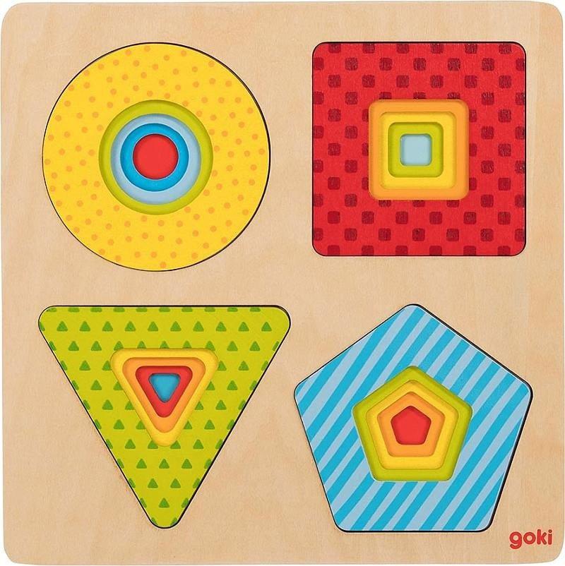 Puzzle złożone z 16 elementów ułożonych kolejno w 4 dopasowanych do nich wycięciach w podstawce. Cztery kształty Goki stanowią kolekcje kolorowych geometrycznych wzorów wykonanych z drewna w formie układanki warstwowej.