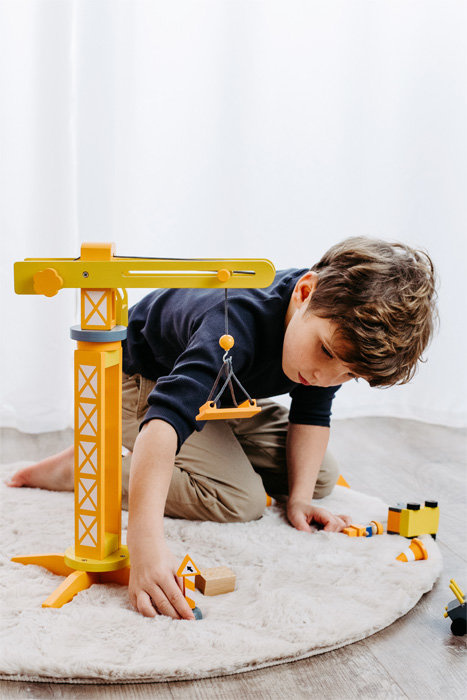 Precyzyjnie wykonany, z solidnego drewna masywny Żuraw Stanisław marki Small Foot, pozytywnie wpływa na koordynację wzrokowo-ruchową dziecka. W skład zestawu wchodzą: pokaźny żuraw z możliwością obrotu 360 stopni, ruchomym wysięgnikiem oraz haki zabezpieczające do transportu. Dzięki słupkom, znakom oraz blokadzie dróg, można zabezpieczyć teren budowy. Za pomocą korby, ładunek znajdujący się na platformie zostaje opuszczony, przez operatora znajdującego się w kabinie. Wszystko jest pod kontrolą!