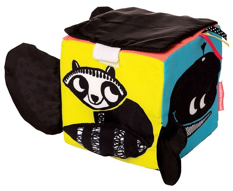 Sześcian pokryty z każdej strony ciekawymi i zróżnicowanymi detalami stymulującymi zmysły maluchów oraz rozwijający ich koordynację, motorykę i wyobraźnię. Miękka edukacyjna kostka Zoo zabawa Manhattan Toy posiada: piszczałkę, gryzak, grzechotkę, elastyczną trąbę słonia, inne wystające elementy należące do pozostałych postaci, zamykane na rzep drzwiczki za którymi znajduje się lusterko, szeleszczący papier, kolorowe wstążki.