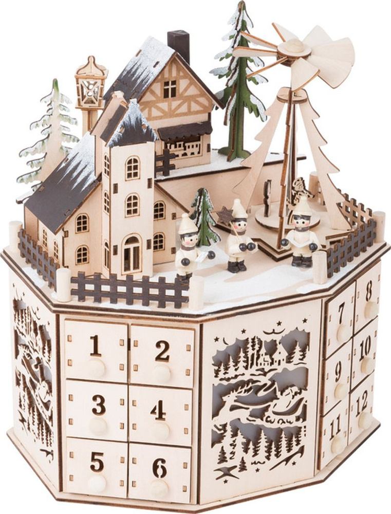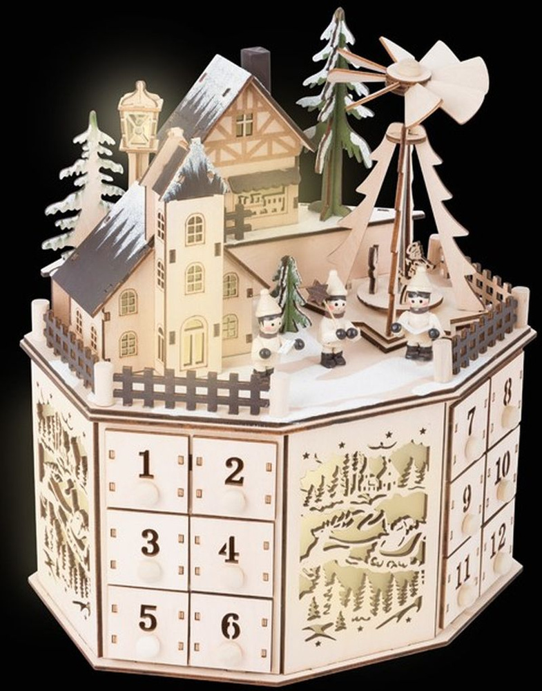 Ten pełen szczegółów kalendarz adwentowy zapiera dech w piersiach swym designem. Podświetlane, historyczne domy oraz piramida bożonarodzeniowa, która jest napędzana elektrycznie, przyciągną wzrok każdego!