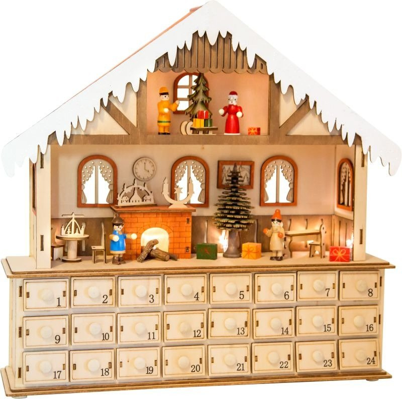 Tutaj jest naprawdę przytulnie! Małe szufladki nie są jedyną rzeczą przyciągającą uwagę. Zasługuje na nią również szczegółowo wykonany, drewniany pokój stołowy. Oświetlenie użyte w jego obrębie oddaje przyjemny, kojący blask będący tak charakterystycznym elementem świątecznej aury. Baterie nie wchodzą w skład zestawu. Ten wspaniały kalendarz adwentowy robi wrażenie na domownikach swoim pięknym wykonaniem i wyjątkowym urokiem.