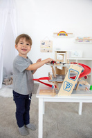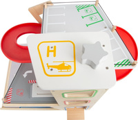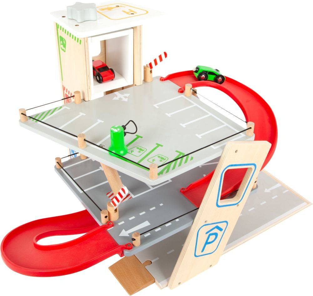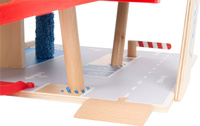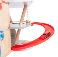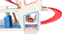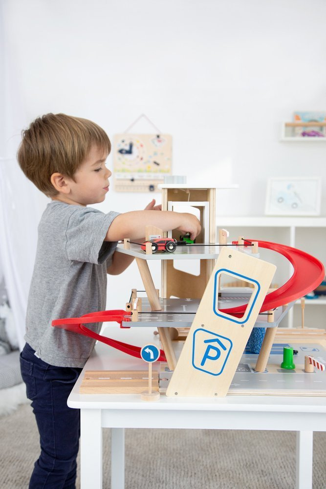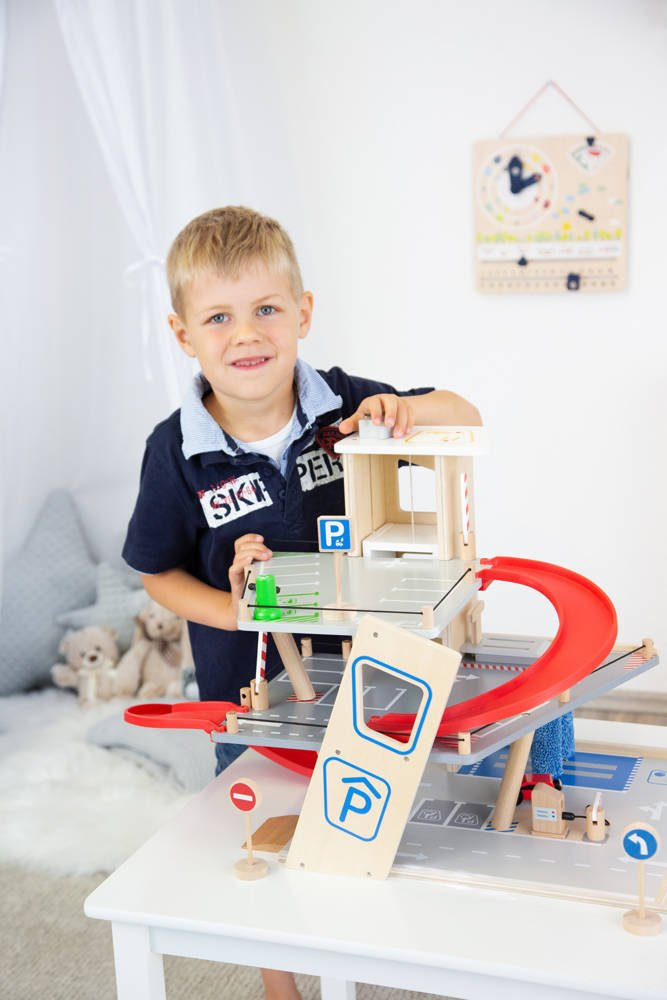 Parking, tankowanie, mycie, naprawa- jeden parking, wiele możliwości! Dwa dołączone samochodziki można zaparkować na trzech różnych poziomach w tym garażu lub za jednym zamachem zjechać po rampach. Po napełnieniu przy dystrybutorze lub stacji ładowania elektrycznego, inspekcji na podnośniku o regulowanej wysokości i przejeździe przez myjnię z ruchomymi rolkami, ulubiony samochód dzieci będzie lśnił jak nowy! Podnośnik samochodowy, sterowany ręczną korbą, przenosi pojazdy na różne poziomy parkingu. Mechanizm blokujący i rowki w podłodze zapewniają, że samochody wjeżdżają na wszystkie poziomy bez poślizgu. Elastyczny gumowy ogranicznik sprawdza się również jako świetna katapulta do autka. Lądowisko dla helikopterów na dachu windy dopełnia zabawę! To absolutny must-have dla młodych fanów parkingów i garaży, a także prawdziwe wzbogacenie floty autek w przedszkolu! Dwie stabilne rampy z tworzywa sztucznego są ustawione w taki sposób, że możliwy jest jeden ciągły wyjazd. Przez cały czas szlabany na zawiasach mogą służyć do kontroli ruchu. Ten zestaw gwarantuje wysoką wartość czasu gry i długotrwałą zabawę! Ten garaż urzeka klientów swoim dobrze widocznym drewnem i typowymi kolorami występującymi w ruchu ulicznym. Ponieważ projekt nie zawiera liczb i słów, nawet najmłodsze dzieci mogą zrozumieć ikony i ilustracje. Unikalna architektura zapewnia dużą stabilność.