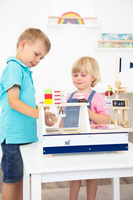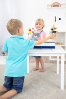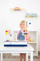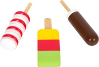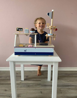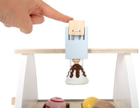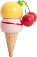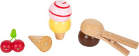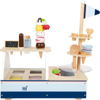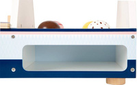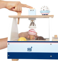 Drewniany zestaw do lodów od Small Foot to gwarancja niekończącej się zabawy rozwijającej wyobraźnię oraz kreatywność. Piękne odcienie różu, błękitu oraz naturalnego drewna dodają całości niezwykle mnóstwo uroku. W skład zestawu wchodzą łopatki do lodów, lizaki lodowe, lody z bitą śmietaną, rożki, wafelki, łyżeczki, gofry w kształcie serduszka i ozdobne wiśnie, które można razem łączyć. Blat lodziarni z plastikowym okienkiem, zamrażarką z przezroczystą pokrywą obrotową wraz z korkiem, stojak na akcesoria i schowek utrzymują porządek. Mała przegroda pod ladą może służyć do przechowywania własnych akcesoriów lub innych zabawek. Atutem zestawu jest łatwa w obsłudze gałka do lodów, która działa na zasadzie magnesu. Za jej pomocą możemy nakładać gałki, bitą śmietaną oraz polewę. Kolorowe lody na patyku możemy umieścić na ladzie w przeznaczonych do tego otworach. Lody można dekorować bitą śmietaną, a także gofrem lub wiśnią. Elementem wzbudzającym zainteresowanie malucha jest dozownik bitej śmietany z polewą, który działa po naciśnięciu jednego przycisku.