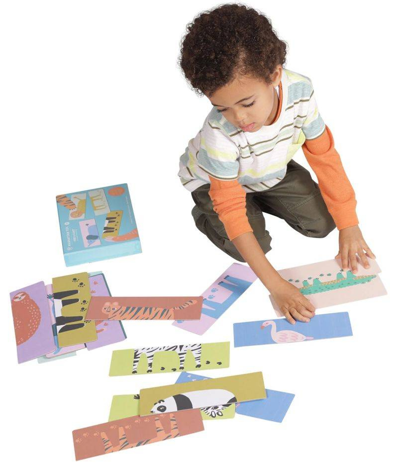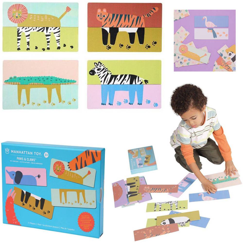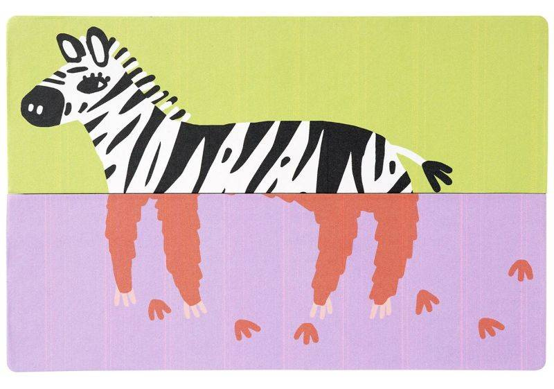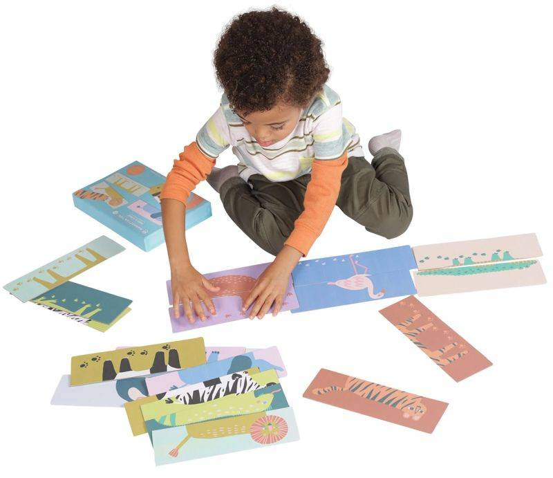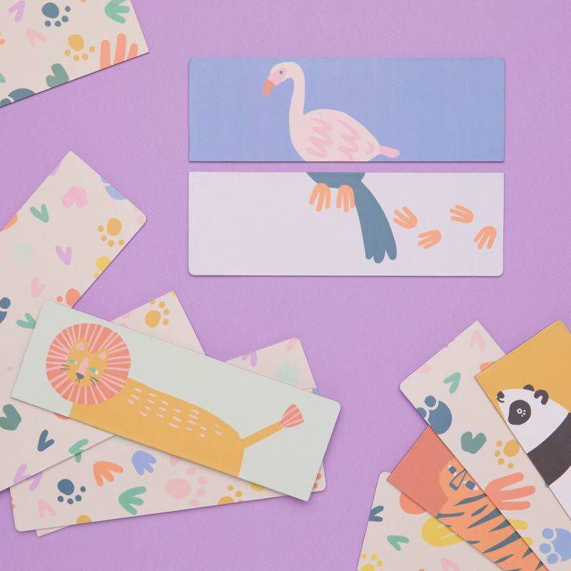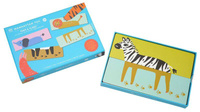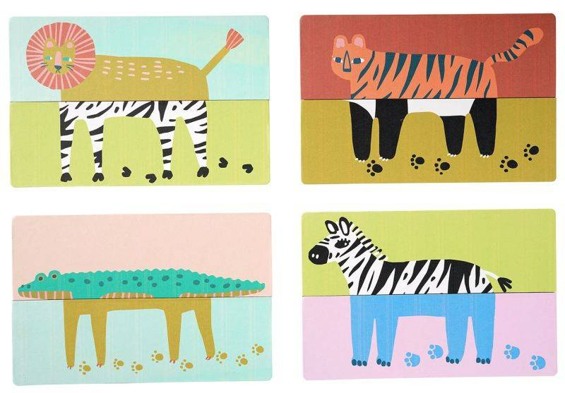 Ułóż 10 sylwetek zwierząt, łącząc ze sobą dwie karty na raz. Mieszaj lub dopasowuj karty, aby tworzyć realne lub własne zwierzęce kreacje. Krokodyl-flaming... dlaczego nie?! Dodatkowo, jeśli umieścisz karty z wzorem do dołu, możesz wprowadzić element gry pamięciowej. Zestaw zawiera 20 kart przedstawiających 10 różnych postaci zwierząt- pandę, słonia, tygrysa, krokodyla, leniwca, lwa, zebrę, iguanę, tukana i flaminga. Karty można przechowywać w estetycznym pudełku.