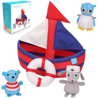 Pięcioczęściowy zestaw do kąpieli składa się z żaglówki, na której znajdują się żeglarze- sówka, misiu i króliczek oraz zapewniające bezpieczeństwo koło ratunkowe. Rewelacyjni towarzysze kąpieli.
