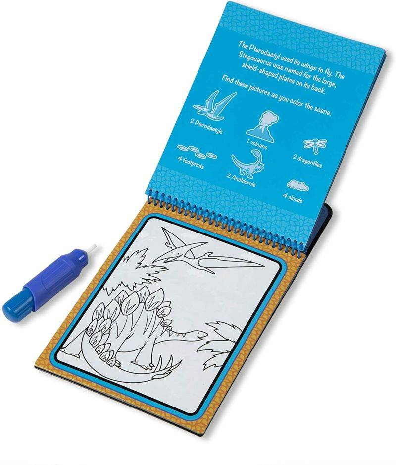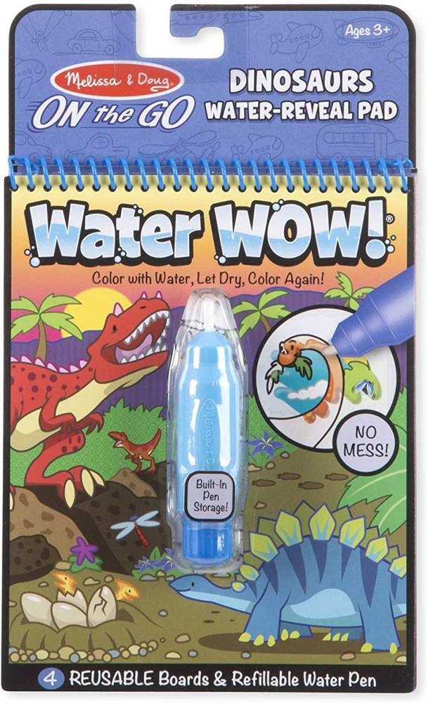 Malowanie dla małych artystów bez bałaganu! Ta wspaniała kolorowanka od Melissa & Doug do malowania wodą zawiera cztery strony wielokrotnego użytku i pisak wodny do ponownego napełniania. Użyj pióra, aby pokolorować każdą scenę, a żywe kolory pojawią się przy każdym pociągnięciu. Następnie pozwól stronie wyschnąć, aby usunąć obrazy i wypełniaj je ponownie. Ta książka o tematyce dinozaurów zawiera cztery scenki do pokolorowania, a także zadania typu „szukaj i znajdź”. Masywny pisak wodny jest łatwy do trzymania przez dzieci i można go schować w przedniej okładce, więc kolorowanki Water Wow są idealnymi zabawkami podróżnymi dla dzieci. Wodna kolorowanka Water Wow Dinosaur Melissa & Doug rozwija umiejętności motoryczne oraz wprowadza do nauki pisania.