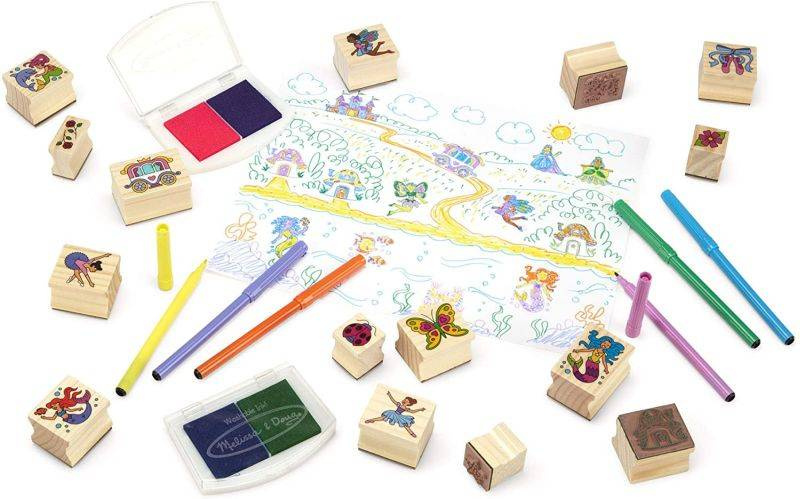 Drewniane stempelki Wróżki Melissa & Doug pomogą Ci stworzyć kolorowe sceny wypełnione magicznymi i ekscytującymi przygodami z bajek. Łatwe do trzymania, wysokiej jakości gumowe stemple z drewnianą rączką i barwne markery są idealne do opowiadania historii, tworzenia projektów artystycznych, kartek, ozdabiania zeszytów i nie tylko. 38-częściowy zestaw zawiera 30 uroczych pieczątek z bajek (balet, syrenka, wróżka i księżniczka), dwa dwukolorowe zmywalne podkładki do pieczątek w kolorze różowym, fioletowym, niebieskim i zielonym oraz sześć kolorowych markerów do wypełniania scen. Zachęcają do rozpoznawania kolorów, tworzenia wzorów, umiejętności zapamiętywania i rozwoju motoryki, a także kreatywności i opowiadania historii.
