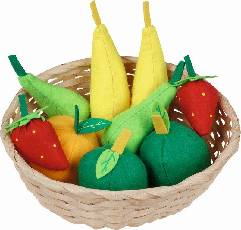 Pleciony koszyczek z filcowymi owocami. Zestaw składa się z 10 elementów.