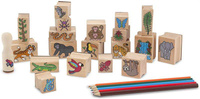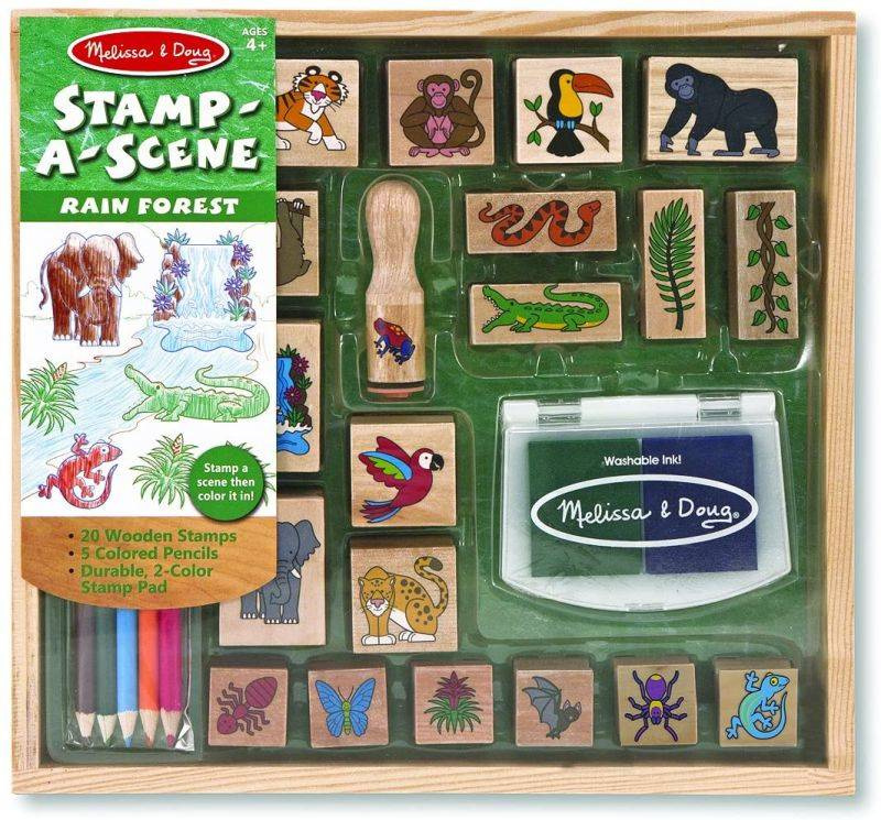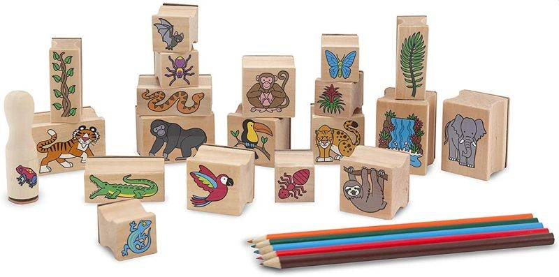 Drewniane stempelki Melissa & Doug, które prezentują zwierzęta zamieszkujące las deszczowy pomogą Ci stworzyć kolorowe obrazki pełne przygód. Łatwe do trzymania, wysokiej jakości gumowe stemple z drewnianą rączką i dołączone do zestawu kolorowe kredki są idealnym połączeniem do opowiadania historii i tworzenia projektów artystycznych. Zestaw zawiera 20 pieczątek, 2 kolorowe tusze oraz 5 kredek. Dzięki wykorzystaniu wszystkich elementów wykonany obrazek będzie ciekawy i kompletny.