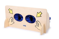 Zmysły dotyku odkrywać można za pomocą tej ciekawej zabawy. Na ściance ze stabilnej sklejki znajduje się woreczek, do którego wkładane są różne przedmioty. Teraz wystarczy tylko włożyć rączki do otworów i już można zgadywać co jest w środku?