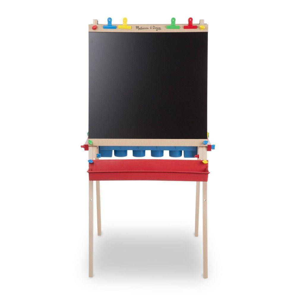 Drewniana tablica edukacyjna z 3 stopniową regulacją Melissa & Doug zamienia każde pomieszczenie w pracownię artystyczną. Dwustronna sztaluga artystyczna o regulowanej wysokości w rozmiarze dziecięcym zawiera tablicę do ścierania na sucho, tablicę kredową, blokowany uchwyt rolki papieru, bezpieczną dla dzieci gilotynę do papieru, cztery łatwe - zaciski na uchwyt i plastikową tackę do przymocowania po obu stronach sztalugi. Montaż jest prosty, więc na kolejne arcydzieło nie trzeba długo czekać. Sztalugi dla dzieci są zalecane do rozwijania umiejętności motorycznych i prawidłowego chwytu ołówka — są świetne dla początkujących pisarzy i malarzy. Użyj powierzchni tablicy jako idealnej powierzchni do ćwiczenia pierwszych liter i słów dziecka. Farby, kubki i pędzle sprzedawane są oddzielnie.