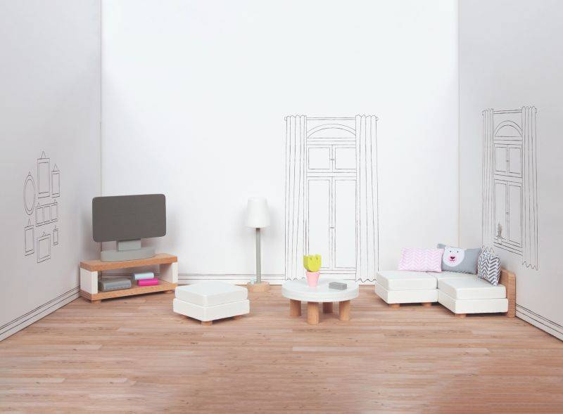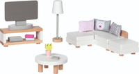 Komplet stylowych mebelków umożliwiający aranżację salonu w domku dla lalek. Wszystkie elementy wyglądają bardzo realistycznie. Odgrywanie scenek z udziałem laleczek wpływa na rozwój wyobraźni i kreatywności dziecka. Książki, kolorowe poduszki i roślinka doniczkowa nadają zestawowi wyjątkowego uroku.