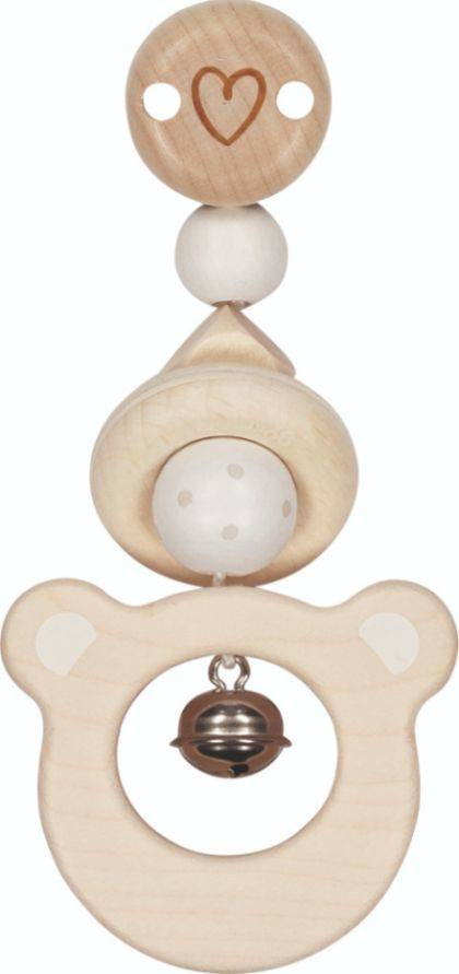 Drewniana figurka, którą za pomocą klipsa można przymocować do ubranka dziecka, wózka lub łóżeczka.