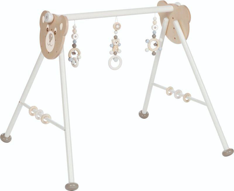 Drewniany stojak w stonowanej kolorystyce. Wykonany z materiałów najwyższej jakości, bezpieczny dla malucha. Posiada regulowaną czterostopniową wysokość, dzięki której można ją dostosować do indywidulanych potrzeb dziecka. Zabawka rozwija zdolności motoryczne, a także koordynację wzrokowo-ruchową.