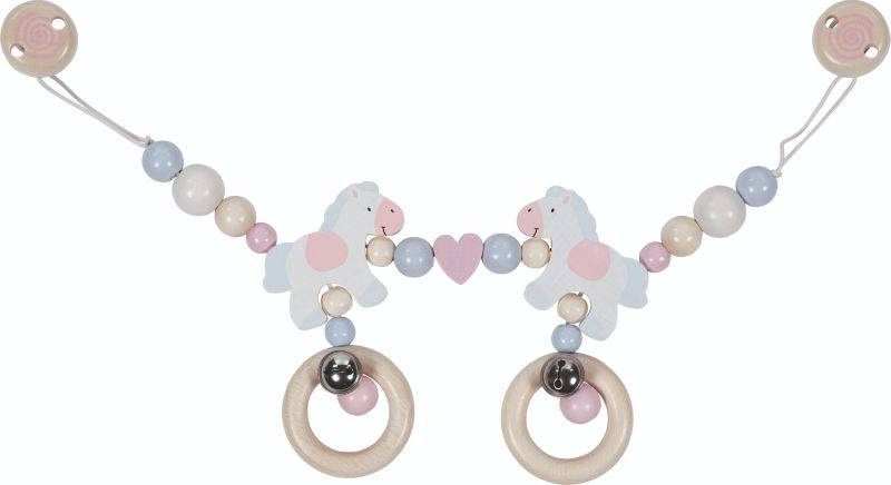 Niezwykła dekoracja wyposażona w dzwoneczek, mocowana za pomocą dwóch klipsów. Zawieszka została wykonana z drewna. Zawieszona w wózku staje się dla najmłodszych atrakcją, która zachęcająca do prób chwytania. Stanowi doskonały i naturalny trening małej motoryki i koordynacji ruchowej.