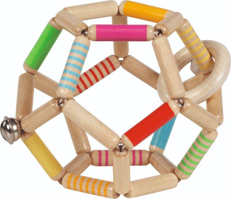 Grzechotka dla dziecka wykonana z drewnianych koralików połączonych sznureczkiem. Delikatnie dzwoniący dzwoneczek zainteresuje dziecko i pobudzi zmysł słuchu.