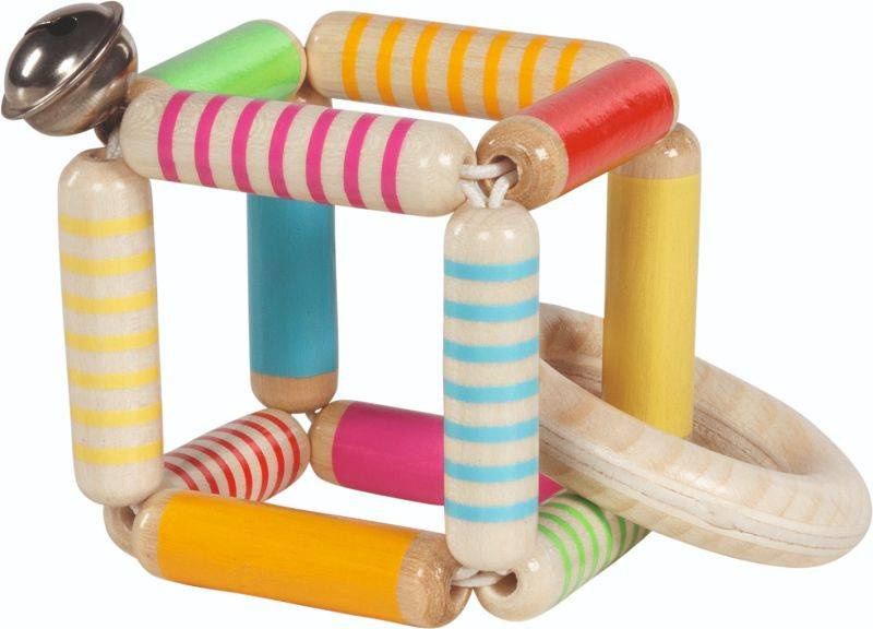 Grzechotka dla dziecka wykonana z drewnianych koralików połączonych sznureczkiem. Delikatnie dzwoniący dzwoneczek zainteresuje dziecko i pobudzi zmysł słuchu.