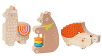 Ten inspirowany zwierzętami drewniany zestaw instrumentów jest idealny dla małych dzieci. Trzyczęściowy zestaw zawiera grzechotkę misia, lamę z klekotkami oraz jeża z guiro na grzbiecie. Każdy ze zwierzaków ma nadruk po obu stronach. Instrumenty zachęcają do muzycznej eksploracji, rozwoju motorycznego oraz uczenia się przyczyn i skutków.