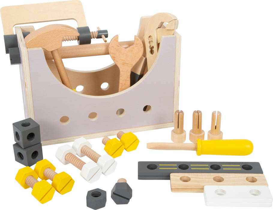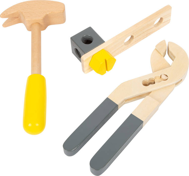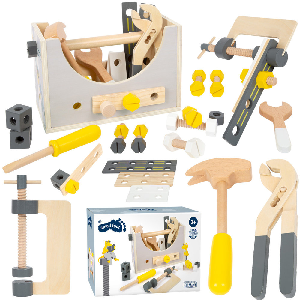 Dzięki tej stabilnej drewnianej skrzynce narzędziowej Miniwob Small Foot w typowych kolorach warsztatowych młodzi konstruktorzy zawsze będą mieli pod ręką swoje profesjonalne narzędzia. Wyposażeni w narzędzia i wszelkiego rodzaju akcesoria, mogą natychmiast rozpocząć budowę. Po odwróceniu zestaw narzędzi świetnie sprawdza się również jako mini-stół warsztatowy. Fakt, że uchwyt i akcesoria można dowolnie zamontować na skrzynce narzędziowej, zapewnia dużo miejsca i dodatkową zabawę. Zestaw składa się z młotka, klucza płaskiego, śrubokręta, klucza do rur, śrub, nakrętek, elementów perforowanych, gwoździ i kostek. Przedmioty obrabiane można zabezpieczyć dużym zaciskiem przed montażem. Majsterkowanie i budowanie ćwiczy kreatywność i zdolności motoryczne, jednocześnie zachęcając do aktywnego odgrywania ról.
