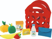 Wykonana z filcu, modna torba na zakupy z artykułami spożywczymi i portmonetką. Zachęca do otwartej i kreatywnej zabawy, pobudza wyobraźnię do odgrywania ról. Jest idealnym uzupełnieniem pokojowego sklepiku.