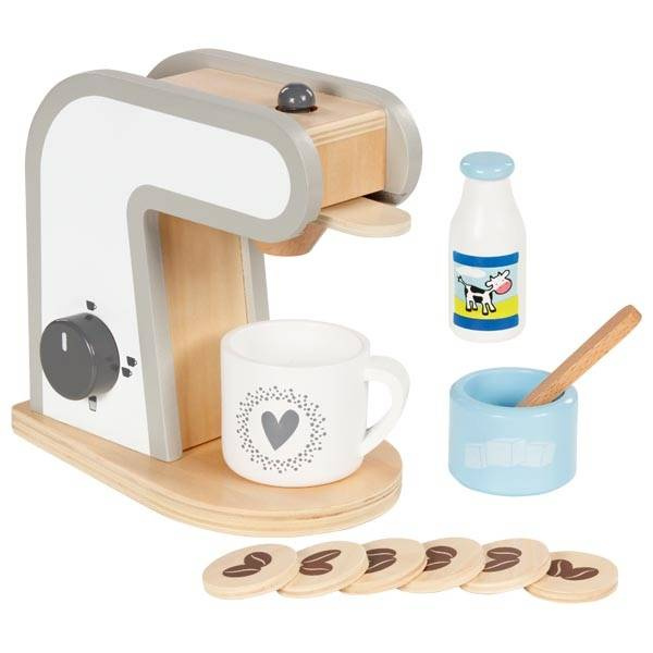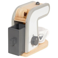 Ekspres do kawy w stonowanych kolorach. Zestaw składa się z wielu elementów. Krążki z kawą pasują zarówno do kolby ekspresu, jak i do filiżanki. Cukierniczka i mleko uzupełniają komplet o wszystko czego potrzebuje mały barista.