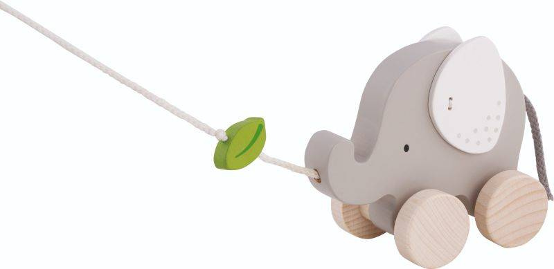 Słoń z listkiem- drewniana zabawka do ciągnięcia na sznurku.