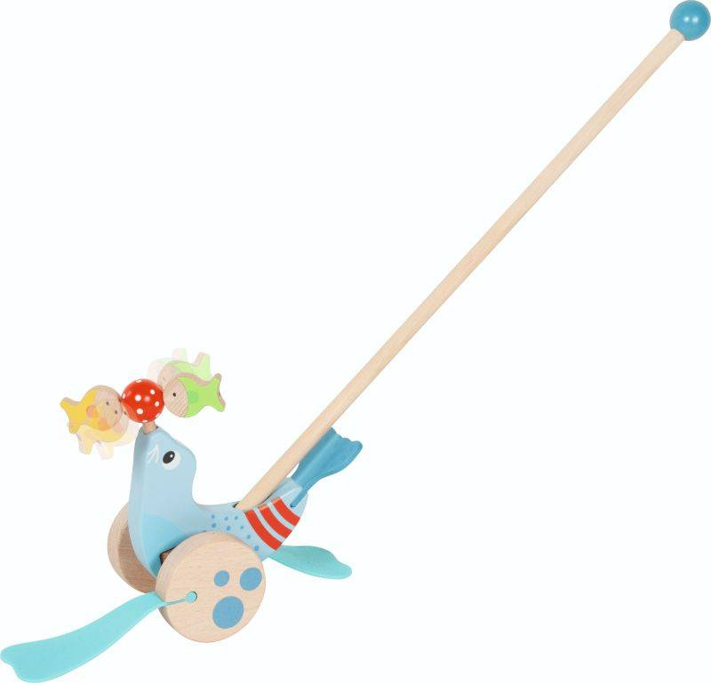 Drewniana zabawka do pchania Foka z obrotowymi rybkami sprawi, że każdy domowy spacer będzie wesoły.