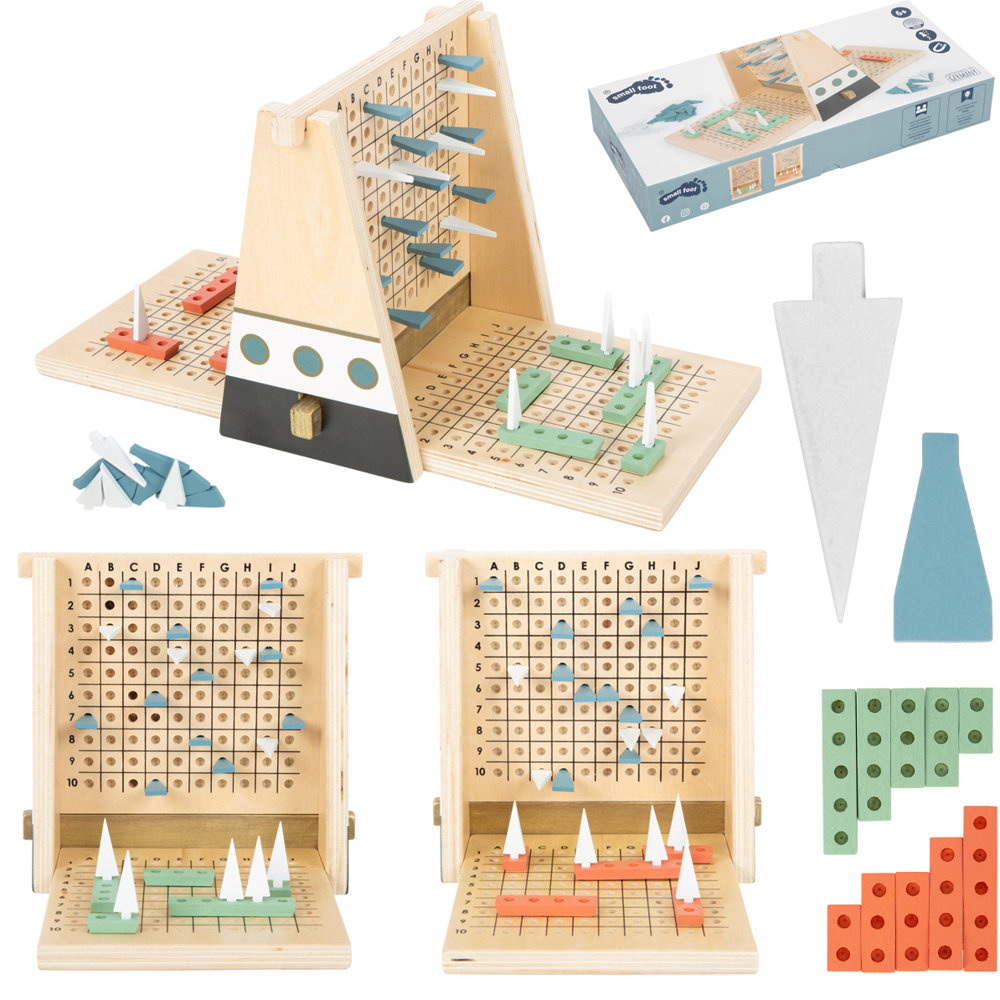 Statki Gold Edition Small Foot to strategiczna gra wykonana w całości z drewna, która robi ogromne wrażenie niezwykłym, skromnym designem z wyrafinowanymi złotymi akcentami w połączeniu z czernią i bielą, pastelowymi kolorami i dużą ilością naturalnego drewna. Ze swoimi łodziami regatowymi, pióropuszami wodnymi i żaglami jest to absolutnie spokojna interpretacja klasycznej gry „Battleship”. Konstrukcja jest szczególnie stabilna dzięki magnesom zintegrowanym z ramą. W zestawie wysokiej jakości pudełko na gry do przechowywania. „Gruba warstwa mgły” blokuje widok pola gry przeciwnika. Wstawiane niebieskie pióropusze wody wskazują, kiedy dana współrzędna znajduje się obok lub wokół łodzi, a białe żagle wskazują, że łódź została znaleziona. Tablice współrzędnych można trzymać pojedynczo w dłoni lub ułożyć w ramie. To kompaktowa gra, która jest idealna, gdy jesteś w drodze lub w podróży.