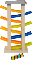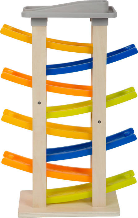Tor wyścigowy XL zachwyci najmłodszych poszukiwaczy przygód. Cztery samochody wyścigowe zjeżdżają po wyjątkowo wysokim torze typu click-clack wykonanym z naturalnego drewna ze stabilnymi plastikowymi rampami. Osiem ramp i jedno wyjście zapewniają wyjątkowo długą frajdę z jazdy. Platforma parkingowa z czterema miejscami parkingowymi znajduje się na szczycie tej wysokiej zabawki i zapewnia wystarczającą ilość miejsc parkingowych dla kolorowych drewnianych samochodzików przed i po szybkich przejażdżkach. Jej stabilna podstawa ułatwia maluchom zabawę. Wspomaga rozwój umiejętności motorycznych i koordynacji ręka-oko. Klikanie i stukanie samochodów zjeżdżających z rampy zapewnia akustyczną atrakcję. Czy jesteś gotowy, aby zacząć?