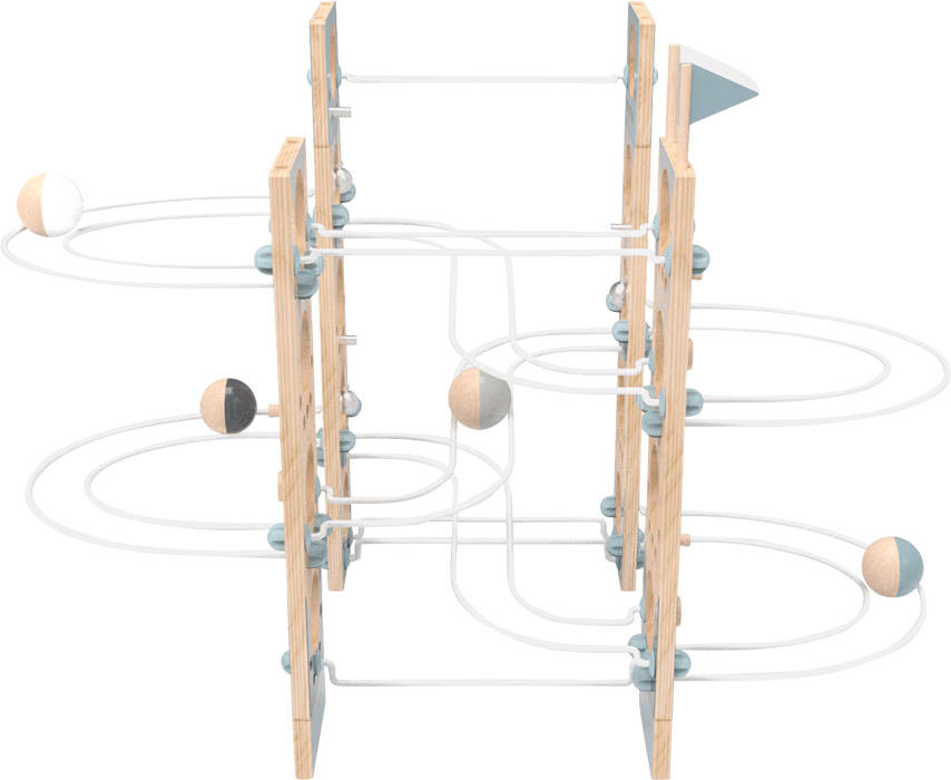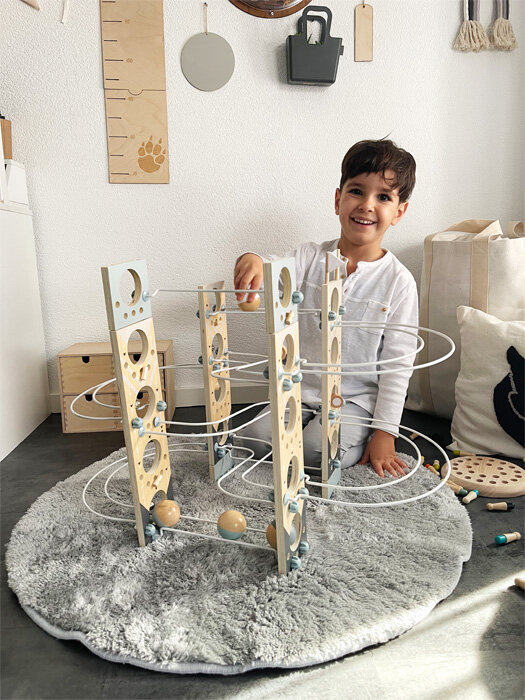 Modułowy kulodrom Marmurowy Bieg w minimalistycznym skandynawskim stylu przyciąga młodych, ambitnych budowniczych. Dzięki elastycznemu systemowi składającemu się z różnych metalowych słupków i specjalnych elementów łączących oferuje wiele możliwości montażowych i konstrukcyjnych. Cztery duże piłki wykonane z litego drewna, korki, dzwoneczki i flaga mety gwarantują długotrwałą zabawę. W zestawie instrukcja z sugestiami montażu, która ułatwi najmłodszym zabawę. Modułowa zasada montażu umożliwia tworzenie nowych, unikalnych torów i inspiruje radość z eksperymentowania i zabawy wypełnionej fantazją. Stopery i małe dzwoneczki spowalniają piłki podczas szybkiego biegu po zakrętach i stromych podjazdach, podczas gdy biało-niebieskie flagi oznaczają początek i koniec wybiegu. Połączenie różnych części w zabawny sposób ćwiczy koordynację wzrokowo-ruchową, podczas gdy dzwonki zapewniają akustyczne akcenty. Dzięki subtelnemu wzornictwu z modnym przydymionym błękitem i dużą ilością naturalnego, niepoddanego obróbce drewna, ten marmurowy tor doskonale pasuje do każdego wnętrza. Po zakończeniu zabawy kulodrom można ponownie zdemontować i przechowywać w sposób oszczędzający miejsce.
