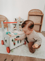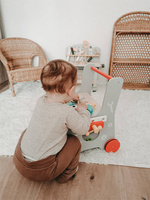 Drewniany chodzik dla dzieci z narzędziami Small Foot ucieszy wszystkich małych majsterkowiczów. Wykonany z drewna wysokiej jakości posiada liczne akcesoria, które gwarantują wspaniałą zabawę. Oprócz nauki chodzenia drewniany chodzik oferuje również mini warsztat narzędziowy. Maluchy mogą bawić się młotkiem, śrubokrętem i kluczem, korzystając z wielu otworów w górnej części chodzika, a narzędzia można przechowywać w środku - zwłaszcza wkładając je w odpowiedni otwór z przodu. Dzięki różnego rodzaju akcesoriom małe dzieci mogą wkręcać, wiercić i młotkować — jest nawet imadło z obrotowym wrzecionem. Pojazd wyposażony został w gumowe, antypoślizgowe kółka bezpieczne dla naszych podłóg. Zabawa chodzikiem ćwiczy zręczność i motorykę, a także sprawia, że maluchy mogą być mobilne.