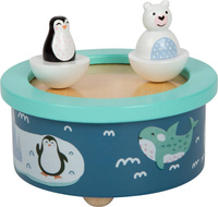 Pozytywka z drewna Arktyka Small Foot gwarantuje słodkie sny każdemu maluchowi. Dwie magnetyczne figurki pingwin i niedźwiadek polarny krążą po tafli lodu w rytm delikatnej melodii ,,Twinkle, Twinkle Little Star". Obie drewniane figurki można wyjąć z pudełka, a dzieci mogą samodzielnie obsługiwać pozytywkę dzięki jej łatwej obsłudze. Urocze detale w połączeniu ze spokojną muzyką zapewniają relaks i towarzyszą dzieciom w krainie snów. Jest to pozycja obowiązkowa dla wszystkich małych fanów śniegu i lodu, a w pokoju dziecinnym będzie prawdziwą ozdobą, która przyciągnie wzrok.