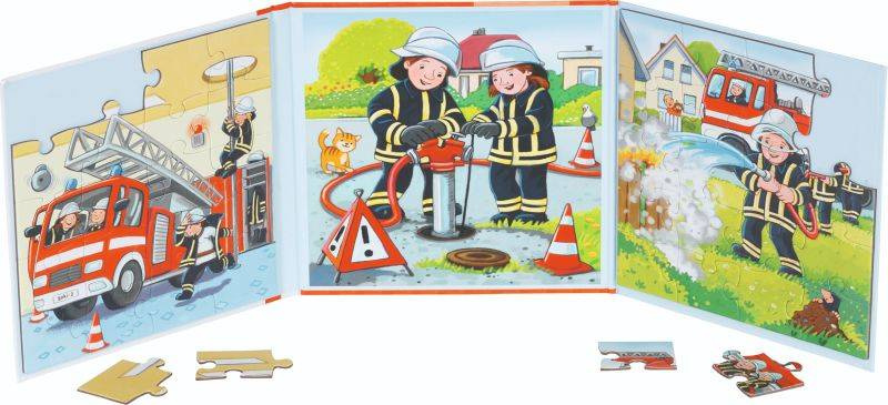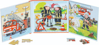 Rozkładana książeczka z 2 motywami puzzli. Podczas układania 20 magnetycznych elementów dziecko ćwiczy się zręczność i zdolności motoryczne. Po ułożeniu obrazka dzieci mogą się nim inspirować i opowiadać historie.