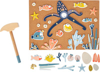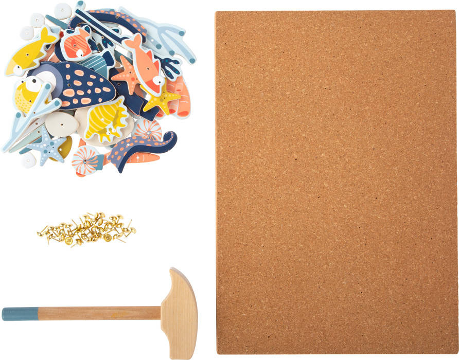 Przybijanka Życie morskie Small Foot to kreatywny zestaw dla każdego małego odkrywcy. Wyposażona w tablicę korkową, drewniany młotek, ćwieki i różne elementy obrazkowe z laminowanego drewna, ta gra w przybijanie pozwala tworzyć liczne motywy z podwodnego świata. Różne stworzenia morskie, koralowce, kamienie i duża ośmiornica, które można złożyć z różnych elementów, zapewniają różnorodną zabawę i umożliwiają tworzenie wyjątkowych obrazków. Ta gra zręcznościowa w zabawny sposób promuje rozwój kreatywności i daje dzieciom przestrzeń do tworzenia własnych dzieł. Wysokiej jakości ilustracje z bogatą w detale, przyjazną dzieciom grafiką oraz nowoczesna kolorystyka w modnych odcieniach musztardowej żółci, koralu i przydymionego błękitu ucieszy każdego.