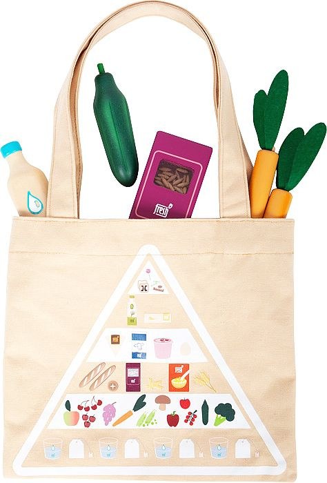 W pakiecie znajduje się również praktyczna, bawełniana torba odpowiednia na prawdziwe lub zabawowe zakupy. Umieszczona na niej atrakcyjna grafika przedstawiająca piramidę żywieniową wpisuje się trend prowadzenia zdrowego trybu życia oraz promowania zbilansowanej diety.