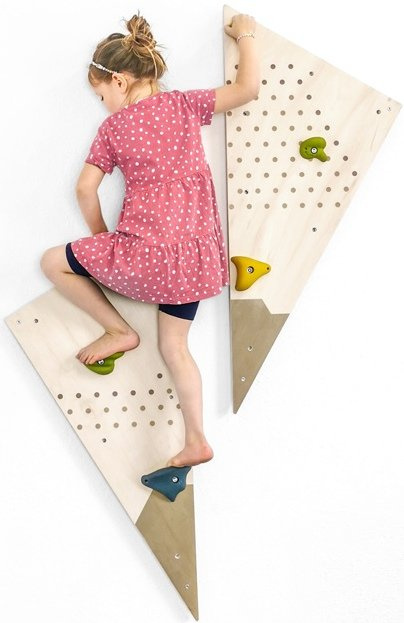 Stabilna wewnętrzna ścianka wspinaczkowa do pokoju dziecięcego składa się z dwóch trójkątnych modułów, każdy z 9 nawierconymi otworami. W zestawie 6 uchwytów wspinaczkowych wykonanych z wytrzymałego tworzywa sztucznego. Chwyty wspinaczkowe można rozmieścić elastycznie, dostosowując do potrzeb dzieci. Dołączone elementy dystansowe do mocowania do ściany. Dzięki ściance wspinaczkowej każdy pokój dziecięcy stanie się placem zabaw! Kompatybilna z kamieniami wspinaczkowymi „Adventure”. Wraz z innymi zabawkami ruchowymi z linii „Adventure” można zbudować kompletny plac gimnastyczny na ścianie i podłodze. Doskonały trening motoryki połączony z zabawą.