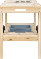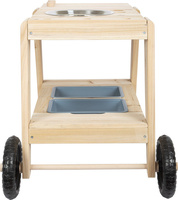 Mobilna kuchnia do zabawy na świeżym powietrzu wykonana z naturalnego drewna. Pomimo niewielkich rozmiarów zapewnia dużo miejsca na kreatywną zabawę. W zestawie wyjmowana misa, płyta kuchenna z pokrętłami i pojemniki na spodzie, które oferują miejsce do przechowywania zabawek. Z kółkami do pchania i otworem na wąż ogrodowy.