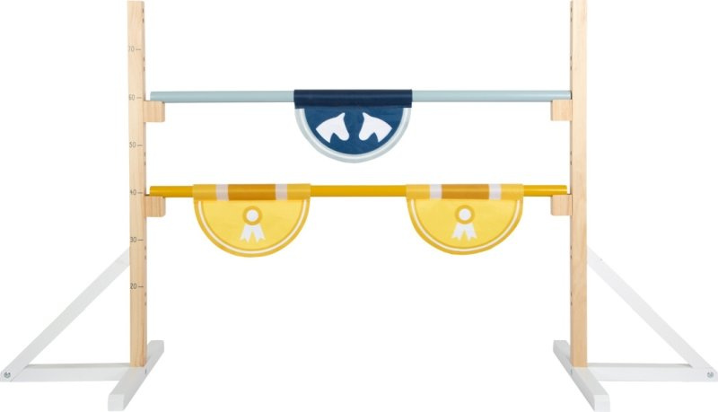 Przeszkody wykonane z litego drewna zapewnią mnóstwo radości podczas skakania wszystkim młodym miłośnikom koni. Płotek posiada regulowaną wysokość od 20 do 70 cm, wystarczy włożyć dwa słupki w odpowiednie otwory. Trzy małe flagi stanowią autentyczną dekorację poprzeczki. Zestaw przeszkód Hobby Horse to popularna rozrywka wśród fanów koni w każdym wieku! I tak jak w przypadku prawdziwego końskiego płotu, tyczka spada, gdy zostanie uderzona podczas skok. Uchwyty na tyczki po obu stronach posiadają nadrukowane wymiary wysokości i stoją solidnie dzięki swoim podstawom.