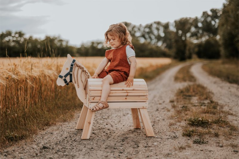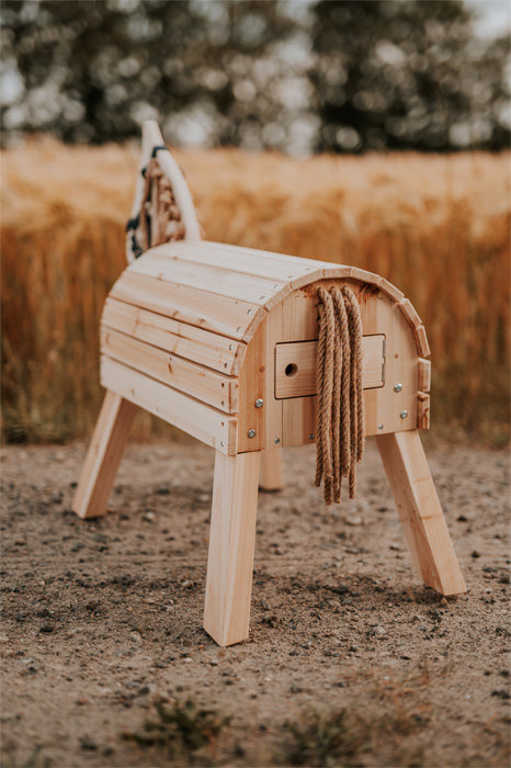 Kompaktowa wersja drewnianego konia jest idealnym partnerem do zabawy, jazdy konnej i skoków dla wszystkich fanów koni. Koń ma ok. 50 cm wysokości, dzięki czemu jest łatwy do wspinania się dla młodych jeźdźców. Rozstawione nogi zapewniają stabilną pozycję stojącą.