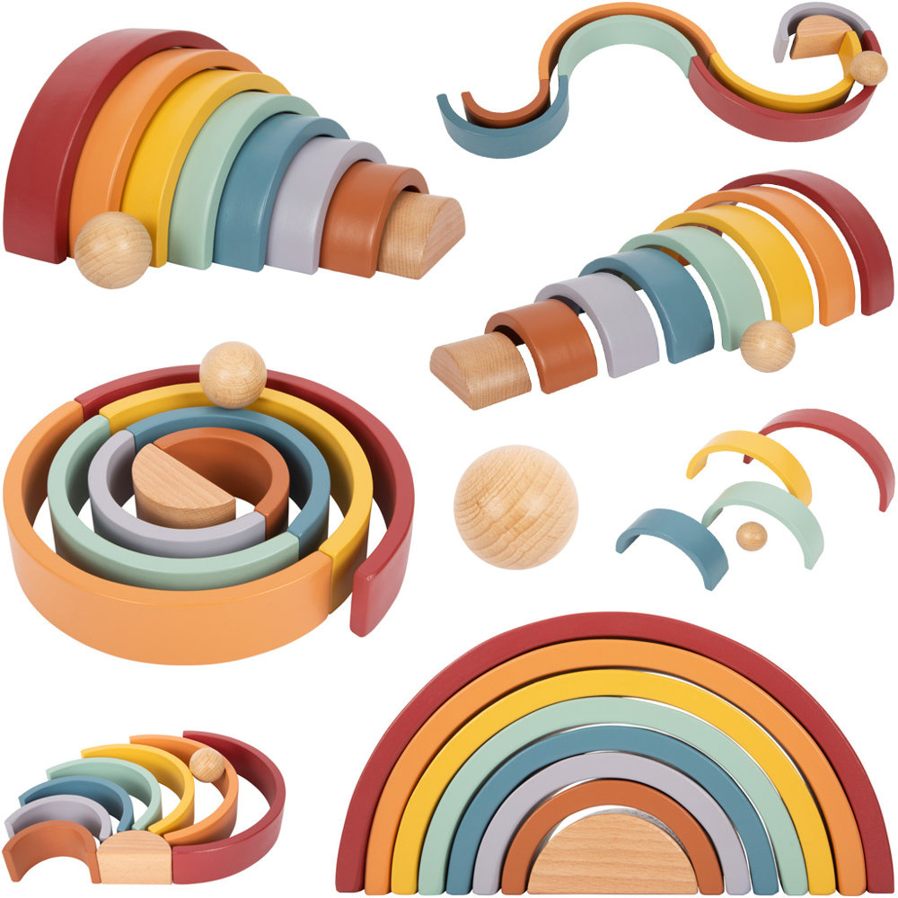 Ta solidna drewniana Tęcza Safari w towarzystwie piłki z naturalnego drewna jest idealnym towarzyszem zabaw dla maluchów. 8 drewnianych łuków w modnych kolorach tęczy można wykorzystać na wiele sposobów, takich jak sortowanie, budowanie czy układanie.