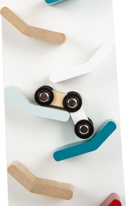 To uspokajająca, a zarazem fascynująca drewniana zabawka! Po wypuszczeniu na górę, ruchome pojazdy przegubowe ścigają się po torze samodzielnie i wykonują szybkie salta. To sprawia, że każda przejażdżka jest zabawą, dzięki czemu wieża kaskadowa pozostaje zabawą na długi czas. Ze względu na nowoczesną kolorystykę połączoną z bielą i naturalnym drewnem, jest to również świetny element wystroju!