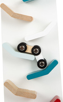 Zabawa w swobodne zjeżdżanie autkami! Ta drewniana wieża kaskadowa przyciąga wzrok wszystkich, gdy kolorowe, przegubowe samochodziki pędzą w dół po różnych poziomach toru i wydają charakterystyczne odgłosy klekotania, a na koniec pędzą po podłodze na ostatnią przejażdżkę. W zestawie jeden 3-częściowy i jeden 2-częściowy przegubowy pojazd.