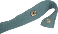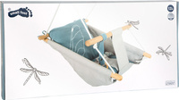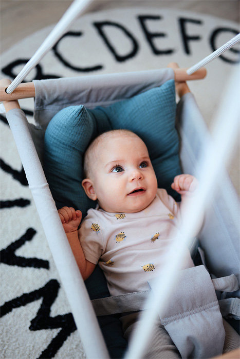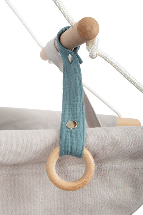 Widoczne drewno i inne naturalne materiały oraz modny, przydymiony niebieski kolor sprawiają, że ten hamak dla dzieci przyciąga wzrok! To jest właśnie to, co sprawia, że dzieci są zrelaksowane i zadowolone! Zaokrąglone krawędzie drewna i ich miękkie kształty zapewniają przyjemne wrażenia dotykowe i duże bezpieczeństwo. Zdejmowaną poduszkę można przymocować do huśtawki za pomocą pętli. Wciskany przycisk zabezpiecza zabawkę/gryzak, a do huśtawki można przymocować również inne akcesoria, takie jak smoczek lub zabawki.