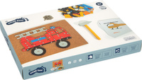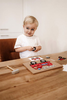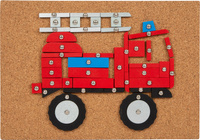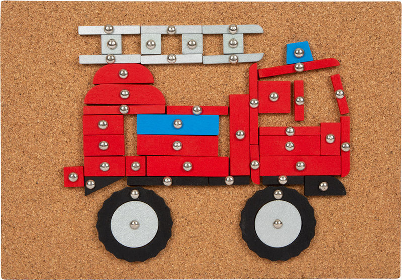 Obszerny zestaw do kreatywnej zabawy w temacie mobilności, pojazdów i scen z miejskiego otoczenia! W komplecie z tablicą korkową, drewnianym młotkiem, pinezkami i wieloma różnymi drewnianymi elementami z laminowanego drewna. Za pomocą tej gry z młotkiem można stworzyć liczne obrazki i motywy.